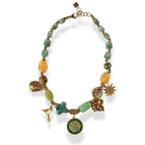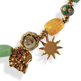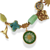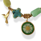 Groene en gouden accenten, sprankelend als Siciliaans zonlicht. Ketting met echte bloem en kleurrijke kralen en gouden bedeltjes.